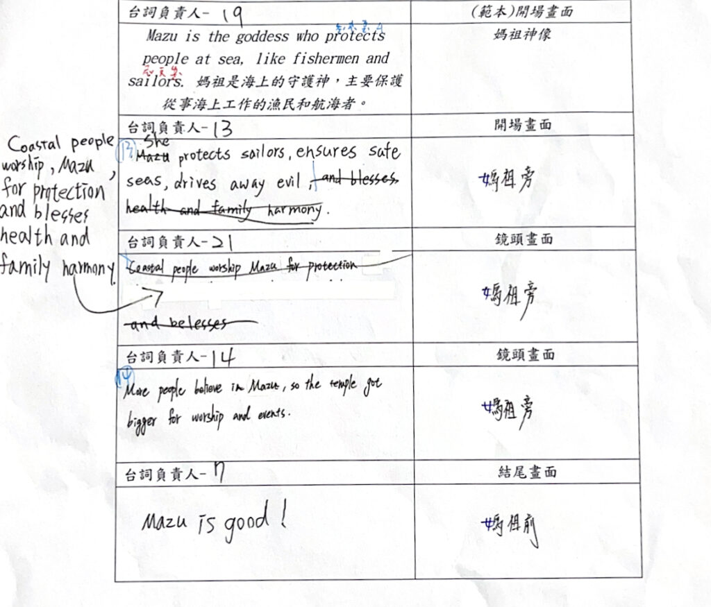 學生依上述三題查找資料並撰寫回答,每人負責一段英文台詞(小組可依個人英語能力分配長度與難度)。導師鼓勵學生運用 GPT 或 Gemini 產出英語句子,再依自身程度調整與精煉。(看圖Mazu is good就知道有多麽簡顯易懂了吧哈哈哈)若遇到不熟悉或不會發音的單字也可以即時查找線上英文辭典聽發音,強化口語表達。為了快速記憶,有些同學甚至使出最原始、最土法煉鋼的台灣方式,在英文單字上方標注音,只為了讓捷克的同學們能理解自己local的英文發音。